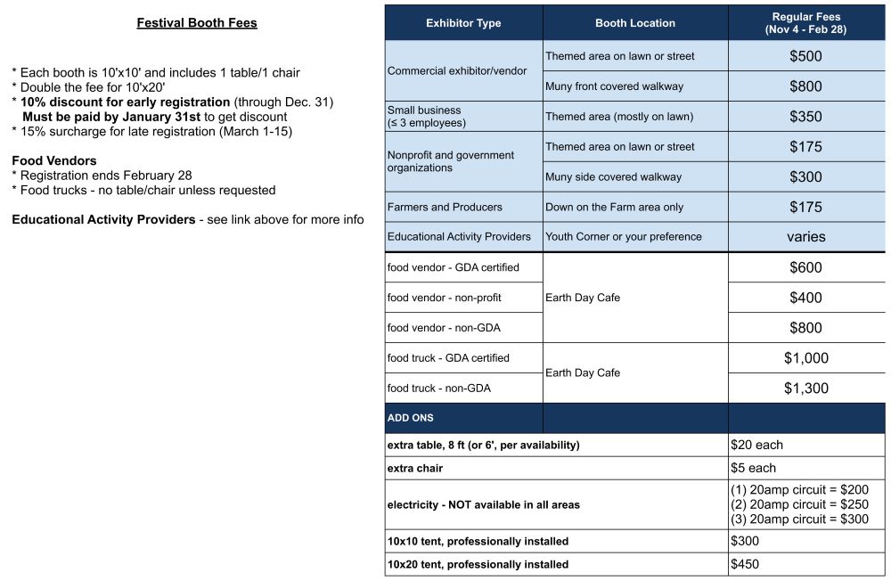 If you prefer your own booth, but need help with the booth fee, email festival@earthday-365.org for our Special Circumstances application. This has to be done before registration closes.